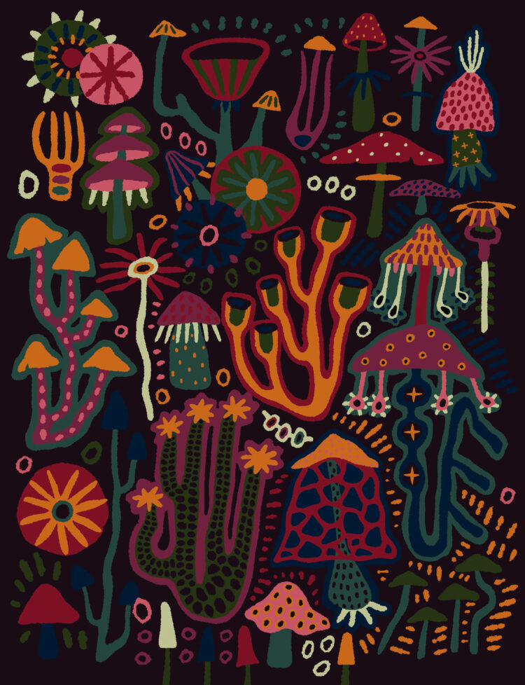 “Ilustrar o tema ‘O invisível entre nós’ foi como reacessar estudos meus desde a adolescência, quando comecei a ter interesse por esses organismos nas aulas de biologia, quando eu tive até vontade de seguir a carreira acadêmica por conta das ilustrações botânicas que via nos livros. Foi uma oportunidade de mesclar uma pesquisa de estilo artístico pessoal – que é fantasiosa, inventa fungos, flores, estampas, padronagens, que é a carreira que segui nas artes e design – com esse interesse na ciência dessas teias, no detalhe a nível celular, que existe desde lá atrás. O resultado foi uma composição rica em vida e energia, sem limites, assim como esses seres.”