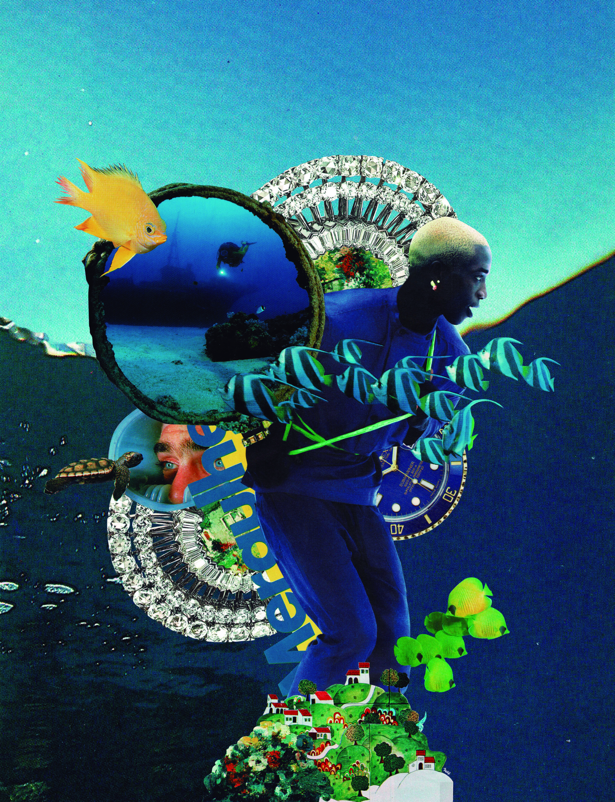 Para chegar ao resultado final da capa para essa edição da Revista Humanos, lancei para mim o desafio de montar essa composição utilizando apenas colagem tradicional, feita à mão, nada de colagem digital. Para tal, vasculhei diversas revistas sobre mergulho e temas variados, a fim de encontrar os elementos que acabaram sendo escolhidos na composição final. Foram muitas tentativas, erros e composições descartadas até chegar ao resultado, mas acredito que esse processo artesanal e meticuloso, de trabalhar apenas com o que as revistas físicas têm a oferecer, fizeram com que eu conseguisse explorar de forma mais profunda e criativa o tema “interações oceânicas”.